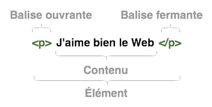 Le HTML utilise des balises qui encadrent chaque élément éléments de la page(titres, paragraphes, saut de lignes, citation, mot importants, etc).